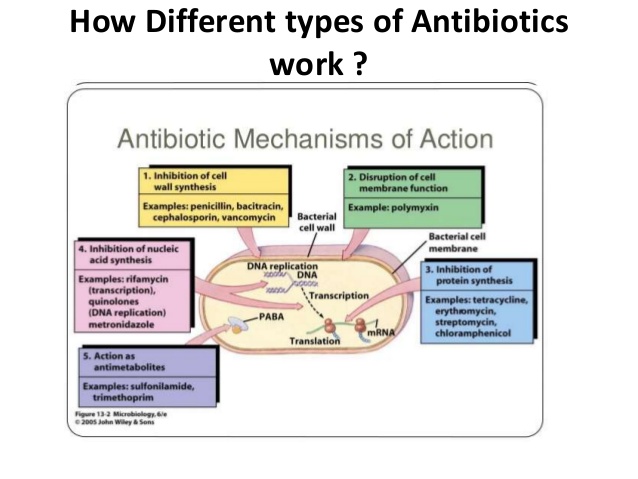Antibiotics are very commonly used substances to eradicate bacterial infections by bacteriostatic or even bactericid effect. They act at a very specific stage (target), although other less important or secondary interactions can occur. We studied the interaction of three antibiotic families (beta-lactamins, aminosides, rifampicin) with bacterial cell. Penicillin disturbs the cell wall synthesis and more accurately the glycopeptide (or murein) formation, a substance giving rigidity or shape to bacteria. It acts in the late phase of murein-biosynthesis, when N-acetyl glucosamin — N-acetyl muramic acid L ala -D glu M-DAP (L lys) -D ala -D ala are linked together by the peptide part, under the effect of several enzymes, particularly transpeptidase and DD-carboxy-peptidase. It would appear that beta-lactame-thiazolidine rings have a steric analogy with dipeptide D-alanyl D-alanine. The result would be that the enzyme would act on the antibiotic instead of peptide: the consequence would be inhibition of the peptidic link, giving an abnormal murein, and an incomplete cell wall i.e. fragile bacteria. Aminosides, particularly Streptomycin, link themselves to 30 S subunit of bacterial ribosome. In this case, it seems that it is a 3”OH function which reacts with lysine (from S 12 protein part of 30 S subunit). The consequence is an alteration in the RNA messager lecture, and a false traduction and consequently protein biosynthesis stops with a decrease of polyribosomes and of the formation of inert 70 S ribosome. Rifamycins, and particularly Rifampicin act by inhibition of RNA messager synthesis. One molecule of antibiotic links itself to one molecule of RNA messager : hydroxyl and cetone function in C1 Cs C21 C23 and “ansa” bridge link to beta subunit of RNA polymerase. This linkage gives a conformational change to the RNA polymerase-DNA complex, inhibiting the catalytic action of this enzyme, and consequently stopping RNA messager and protein synthesis. The study of the action mechanism of these antibiotics enables us to show the action specificity of these products in the bacteria. This specificity is more accurate when the target is not to be found in the eucaryotic cells : in this case the antibiotic may be considered as entirely atoxic. If the study of the action mechanism of antibiotics gives a better understanding of the use of these drugs, their action at a definite stage in bacterial metabolism is a valuable tool for scientists in their approach to cell functioning.