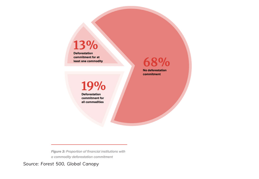 finance contingency efforts. John Scott, Zurich Insurance Group Scott says while investments in technology as well as health care systems would help with preparedness, one way to decrease the risk of pandemics would be to prevent climate change and deforestation, highlighting biodiversity loss and climate change as a cause of the increase in disease spread. “Deforestation drives wild animals out of their natural habitats and closer to human populations, creating a greater opportunity for zoonotic diseases,” says Scott, highlighting that deforestation is linked to 31% of outbreaks such as Ebola, and the Zika and Nipah viruses. Covid-19 is a zoonotic virus thought to have come from bats. By Monday, the virus had infected more than 111,000 people worldwide and claimed more than 3,800 lives. Deforestation, however, is not slowing fast enough and has been exacerbated by extensive fires. According to research from the University of Maryland, the tropics lost 12 million hectares of tree cover in 2018 – the fourth-highest annual loss since record-keeping began in 2001. That figure was expected to be higher in 2019. As a result of increased deforestation, there has been pressure on the financial sector to assess its deforestation financing policies, but with limited success. In February, Global Canopy published its annual Forest 500 report, which identifies and ranks the most influential companies and financial institutions in forest risk commodity supply chains. Source: Forest 500, Global Canopy Of the 150 financial institutions in the rankings, the report identified 102 that had no policies to address deforestation. Just 42 had a deforestation commitment for all commodities, and a mere 19 had a deforestation commitment for at least one commodity. Coverage of deforestation policies is poor across the board, says the report, but financial institutions are least likely to have deforestation policies for soy (23%) and cattle products (19%).