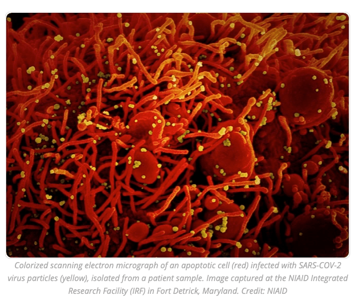 The global pandemic, caused by a novel Severe Acute Respiratory Syndrome Coronavirus-2 (SARS-CoV-2) virus that emerged in China and spread like wildfire across the world, has now reached every continent of our planet besides Antarctica. Colorized scanning electron micrograph of an apoptotic cell (red) infected with SARS-COV-2 virus particles (yellow), isolated from a patient sample. Image captured at the NIAID Integrated Research Facility (IRF) in Fort Detrick, Maryland. Credit: NIAID