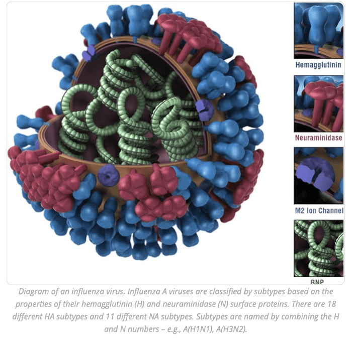 Diagram of an influenza virus. Influenza A viruses are classified by subtypes based on the properties of their hemagglutinin (H) and neuraminidase (N) surface proteins. There are 18 different HA subtypes and 11 different NA subtypes. Subtypes are named by combining the H and N numbers – e.g., A(H1N1), A(H3N2).