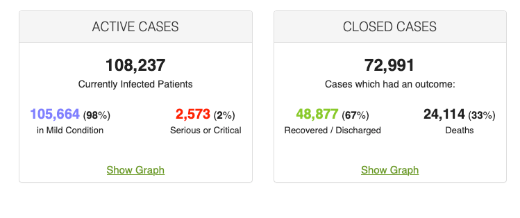 Italy’s civil protection service says 108,237 people are either being treated in hospital or are recovering at home.