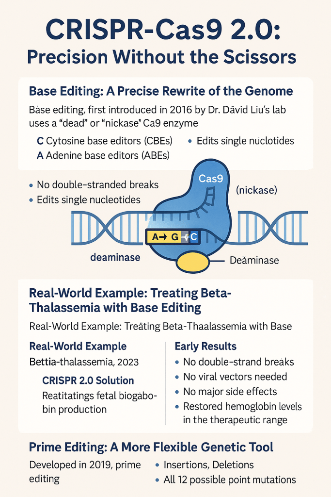 CRISPR-Cas9 2.0 isn’t merely a technological upgrade—it marks the dawn of a new era in medicine and biotechnology. Through tools like base editing and prime editing, we now have the power to correct genetic errors at their root, potentially curing conditions that were once deemed incurable.